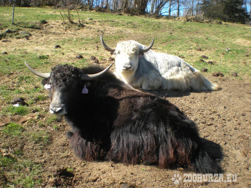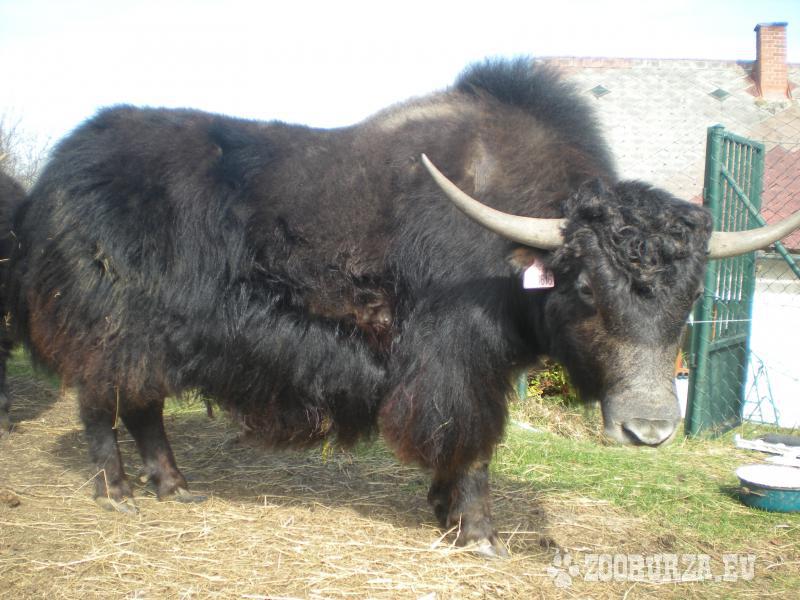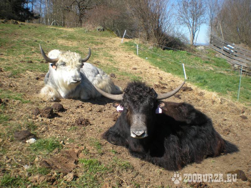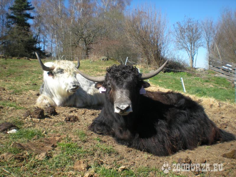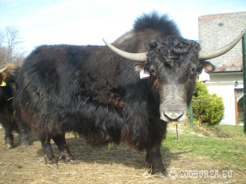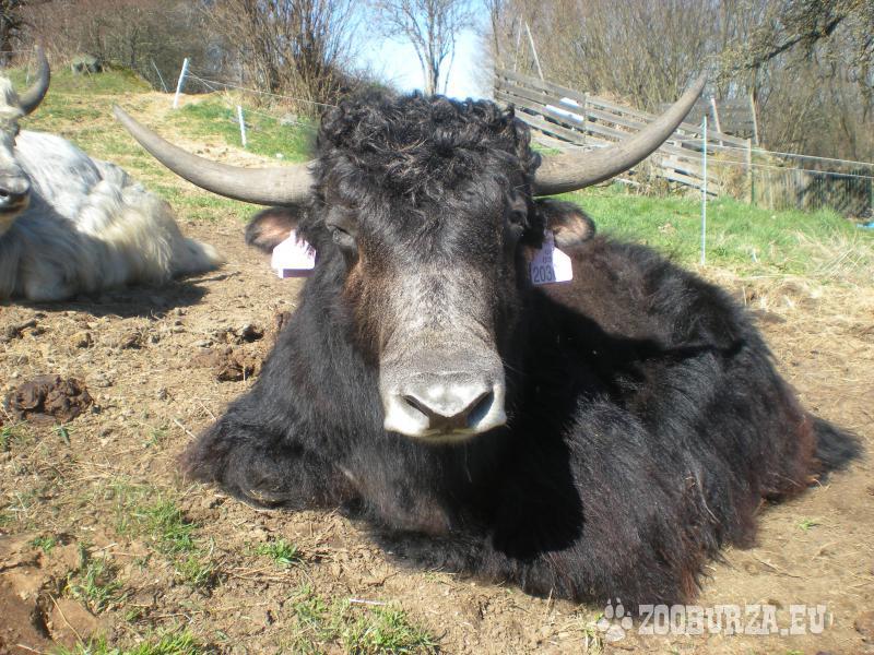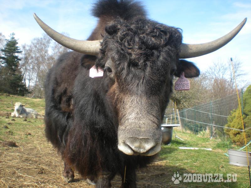 Popis: Tibetský skot (Bos grunniens, jak domácí) - k prodeji je pěkný, energický předloňský býček s nenápadnými barevnými znaky stříbrné, bílé a hnědé na černém základě po matce (otec je celý bílý a je to výtečný kus - je vidět v pozadí některých fotek). Nechá se pohladit od pečovatele a reaguje na pokyny. Je zvyklý na denní společnost lidí i ostatních zvířat a respektuje elektrický ohradník.