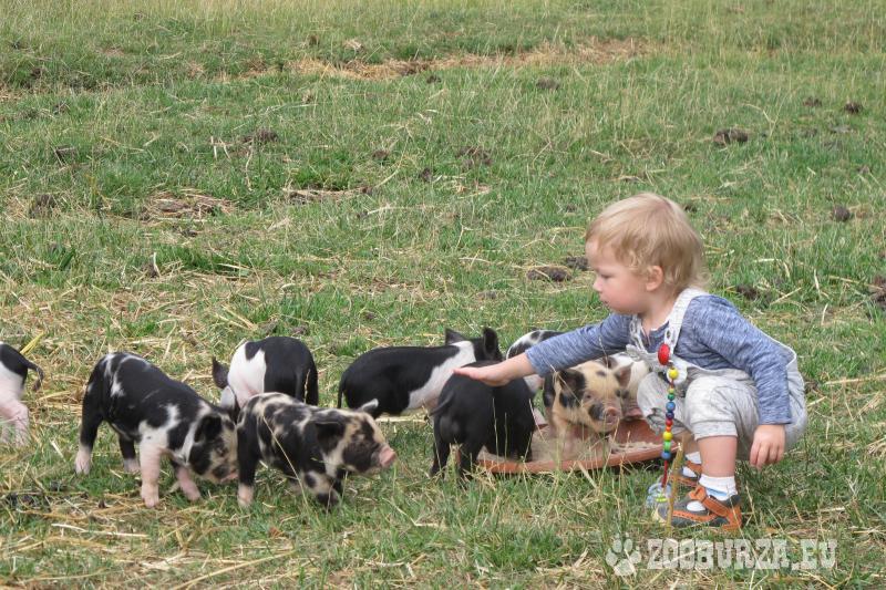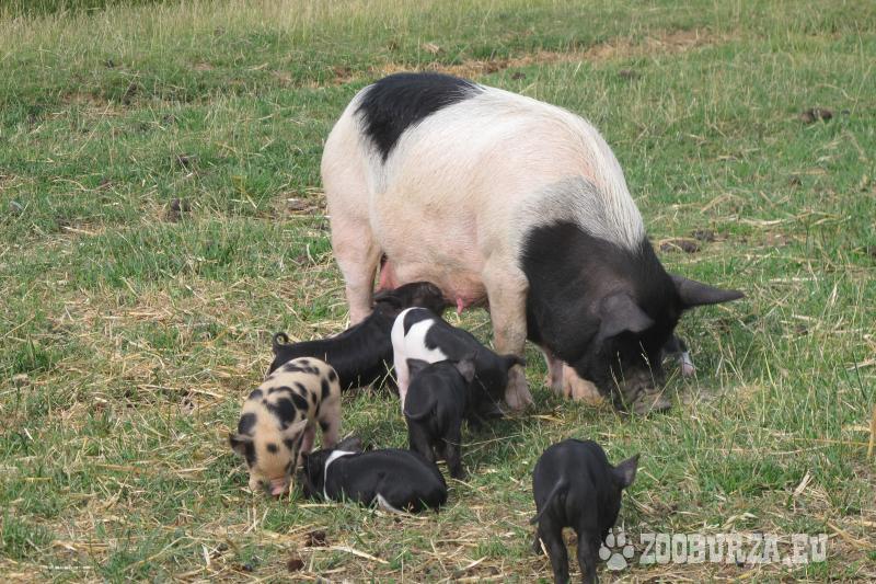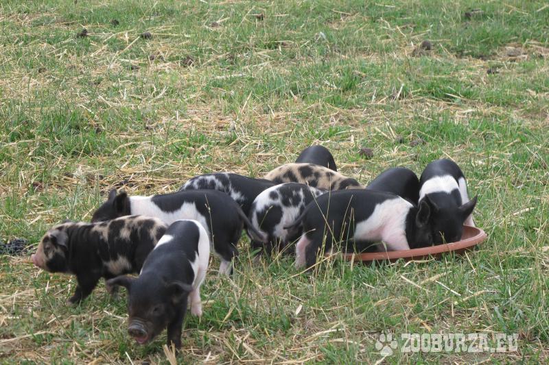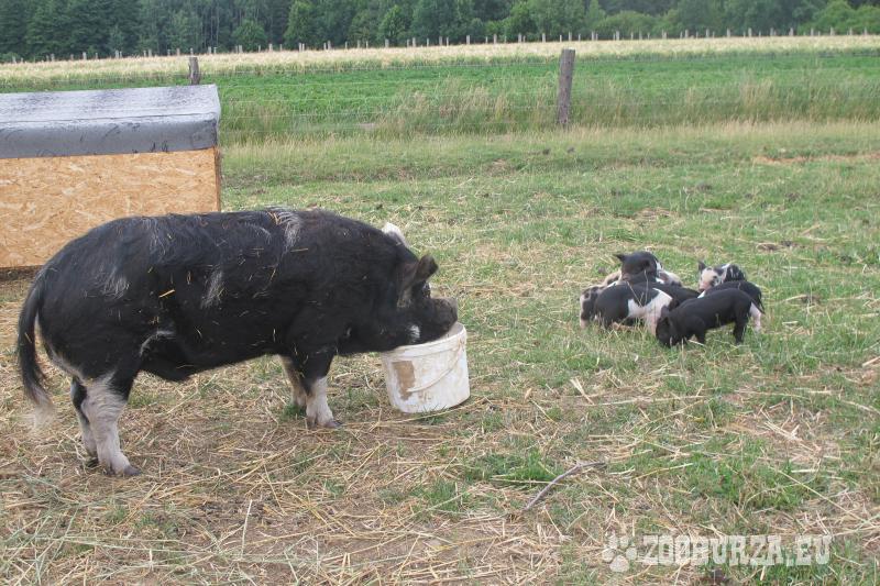 Popis: Prodám pastevecká selata, 75 % kunekune (po otci kunekune a matce 50 % kunekune). K dispozici: 2 černé prasničky a 5 kanečků (černobílý flekatý s rezavými znaky na hlavě, tři černobílí a jeden černý). Prodám samozřejmě i jednotlivě. Matka má skvělé mateřské vlastnosti. Dohoda o ceně a doprava možná. Pasou se, neryjí, respektují elektrický ohradník.